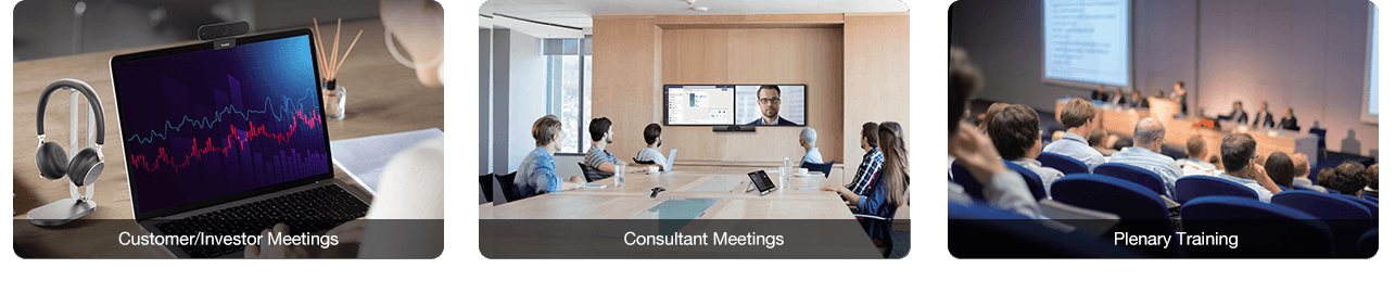 Compatible with mainstream PC platforms and other financial-related IT systems. Consistent high-quality video allows meeting participants to join virtually from any device, boosting attendance and engagement.